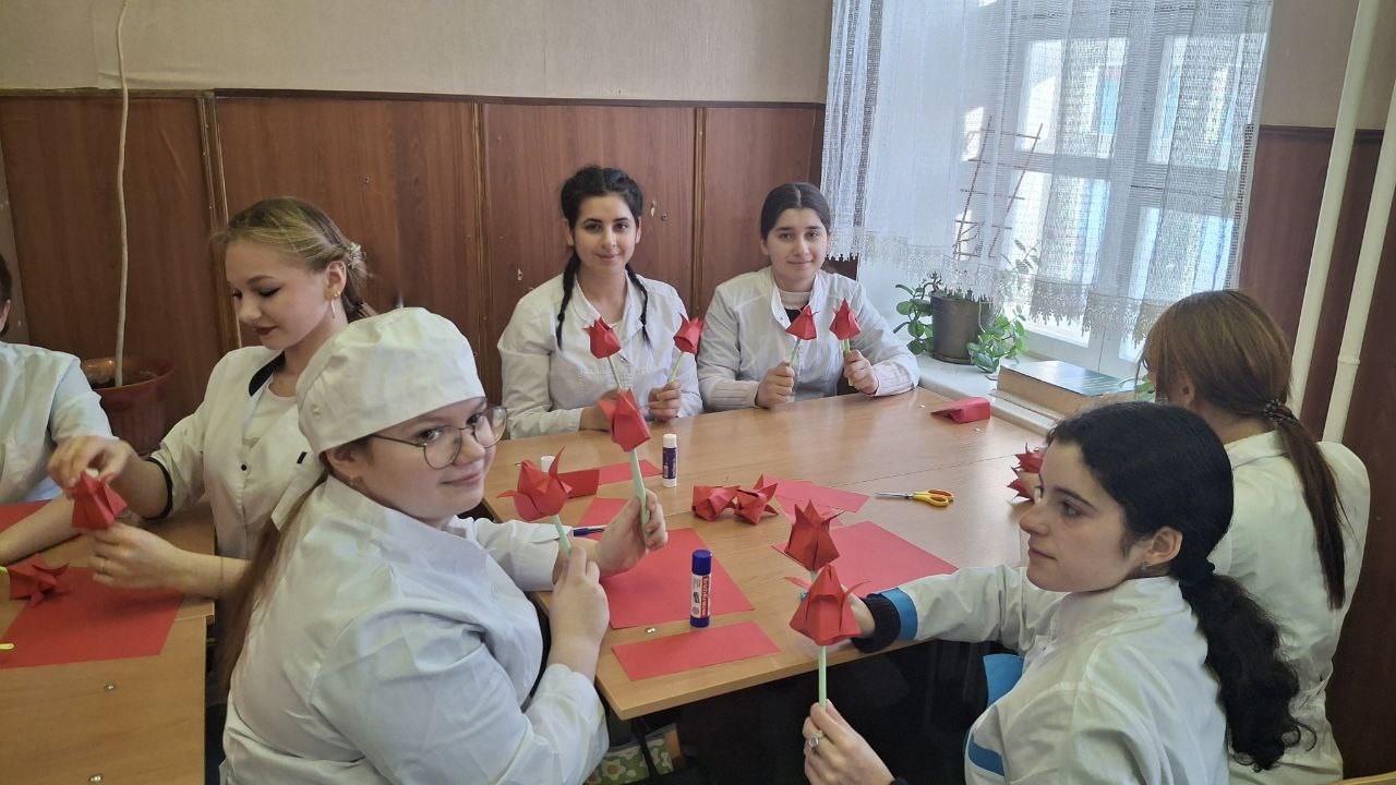 В рамках областной акции «Красный тюльпан», провели мастер-класс по изготовлению поделок в виде красного тюльпана в технике оригами, и разместили их у памятного знака «Героям афганцам».